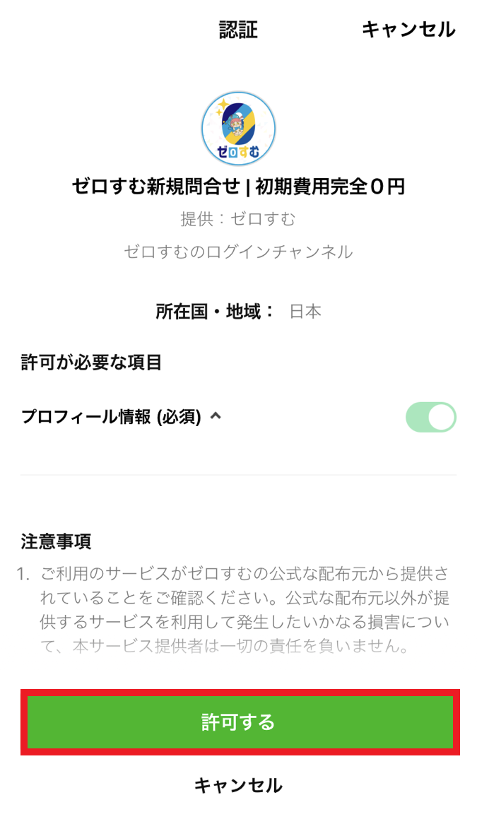 LINEアプリで認証画面が開いたら、「許可」をタップしてください。