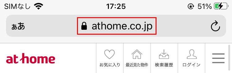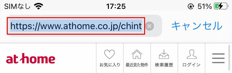 まず、送りたい物件を探します。ウェブブラウザ画面の上部、URLが表示されている部分(アドレスバーと呼ばれる部分です)をタップすると、URLが選択された状態になります。