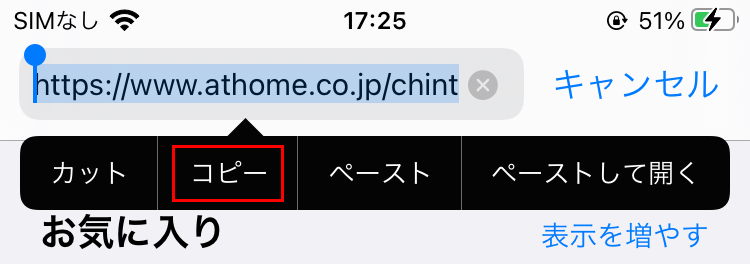 もう一度URLをタップすると、「カット」「コピー」などの操作メニューが表示されます。「コピー」をタップして、URLの文字列をコピーします。これで、コピー操作は完了です。