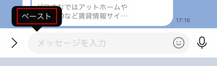 メッセージ欄をタップすると、「ペースト」メニューが表示されるので、「ペースト」をタップします。